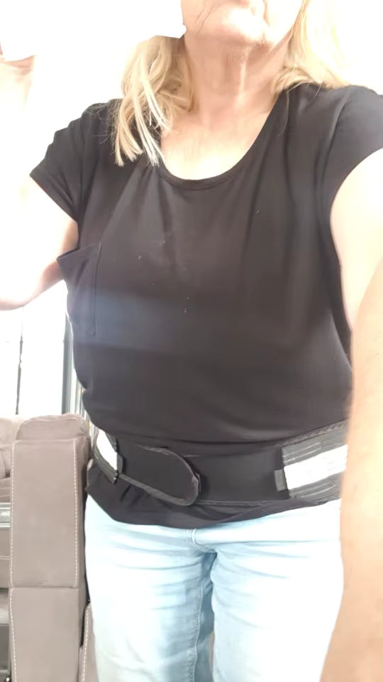 Cierra el cinturón con el velcro principal, adaptándolo a tu contorno de cadera (81–109 cm). Debe quedar firme, pero sin incomodar.