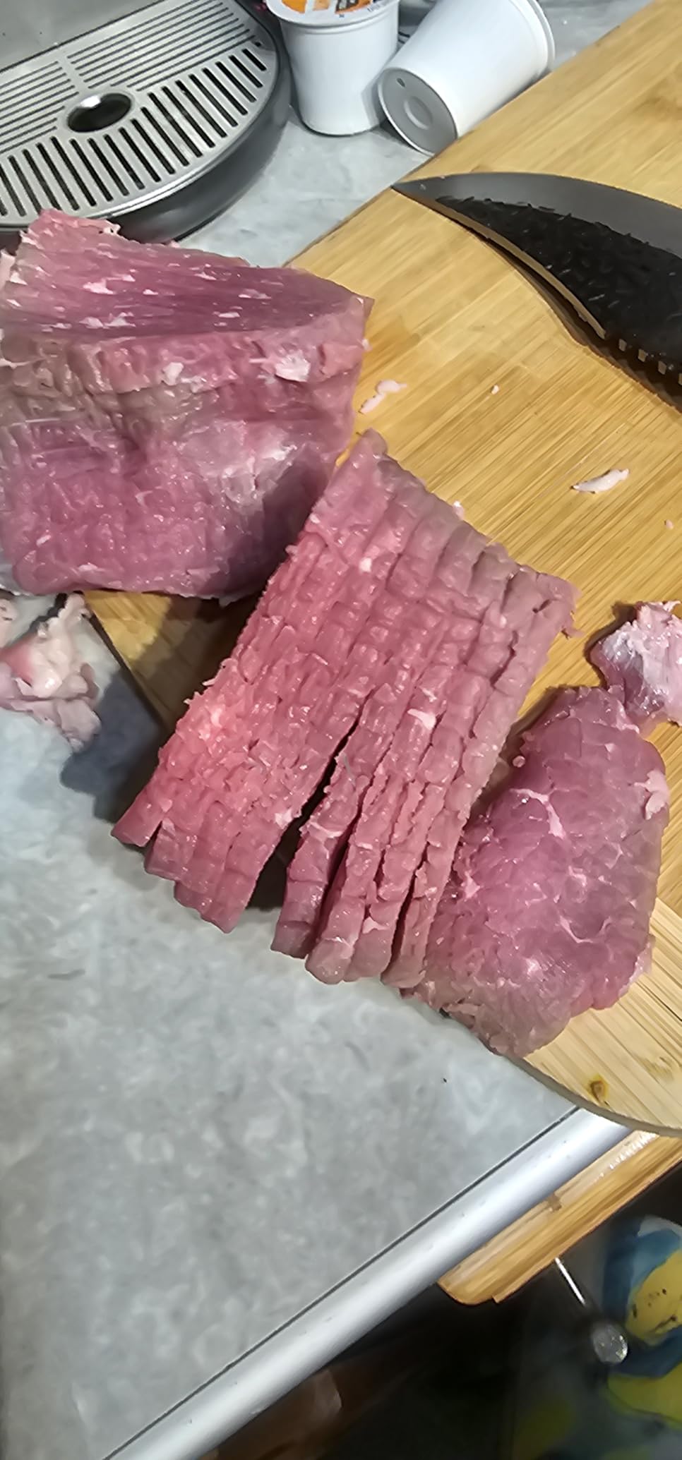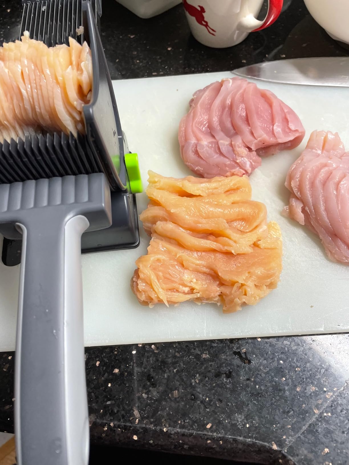 ¡Me encanta, funciona de maravilla! Es muy fácil de usar y los cortes de carne son finos y finos. La cuchilla está muy afilada y ahorra mucho tiempo, Ideal para hacer tiras de pollo deshidratado.