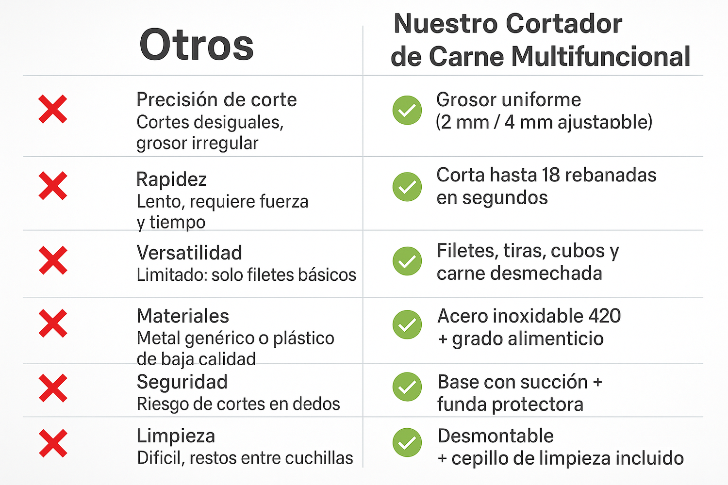 Compatibilidad: carnes frescas sin hueso (pollo, cerdo, res, pescado, cordero).